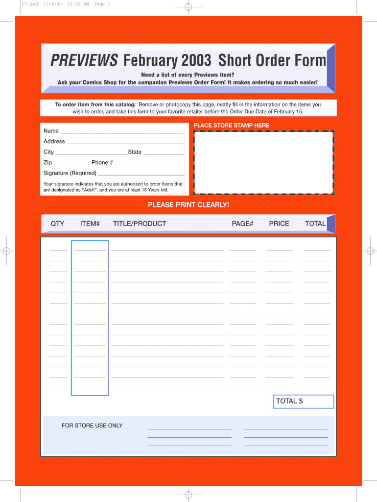 P3.QED 1/14/03 11:09 AM Page 1 Need a list of every Previews item? Ask your Comics Shop for the companion Previews Order Form! It makes ordering so much easier! To order item from this catalog: Remove