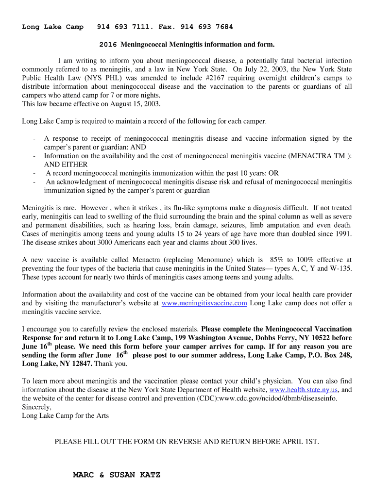 Long Lake Camp 914 693 7111. Fax. 914 693 7684 2016 Meningococcal Meningitis information and form. I am writing to inform you about meningococcal disease, a potentially fatal bacterial infection commonly