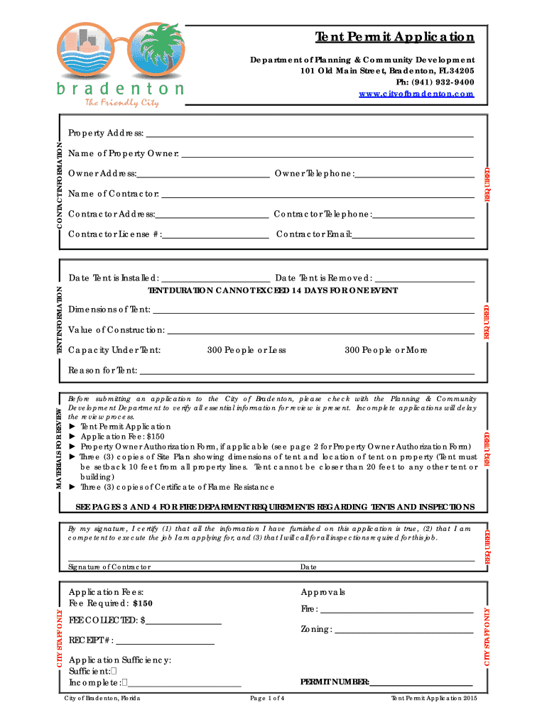 Tent Permit Application Department of Planning & Community Development 101 Old Main Street, Bradenton, FL 34205 pH: (941) 9329400 www.cityofbradenton.com Name of Property Owner: Owner Telephone: REQUIRED