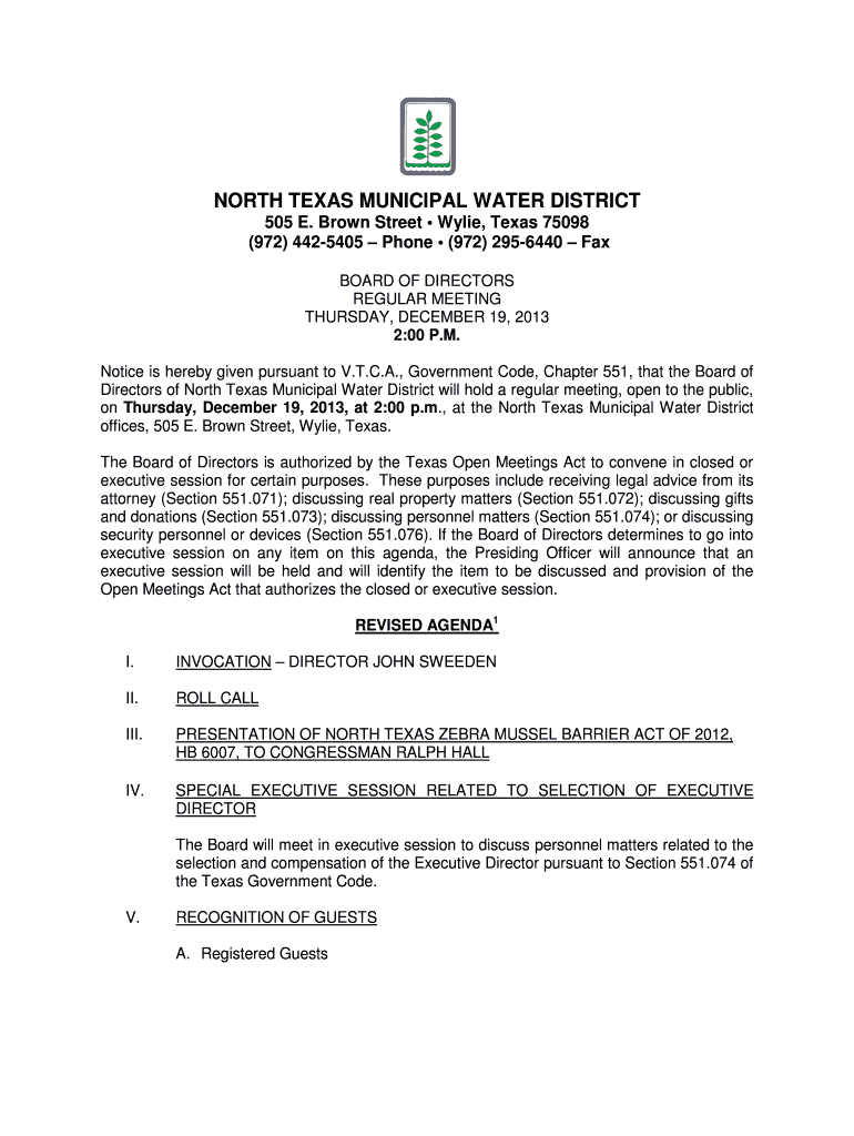 NORTH TEXAS MUNICIPAL WATER DISTRICT 505 E. Brown Street Wylie, Texas 75098 (972) 4425405 Phone (972) 2956440 Fax BOARD OF DIRECTORS REGULAR MEETING THURSDAY, DECEMBER 19, 2013 2:00 P.M. Notice is