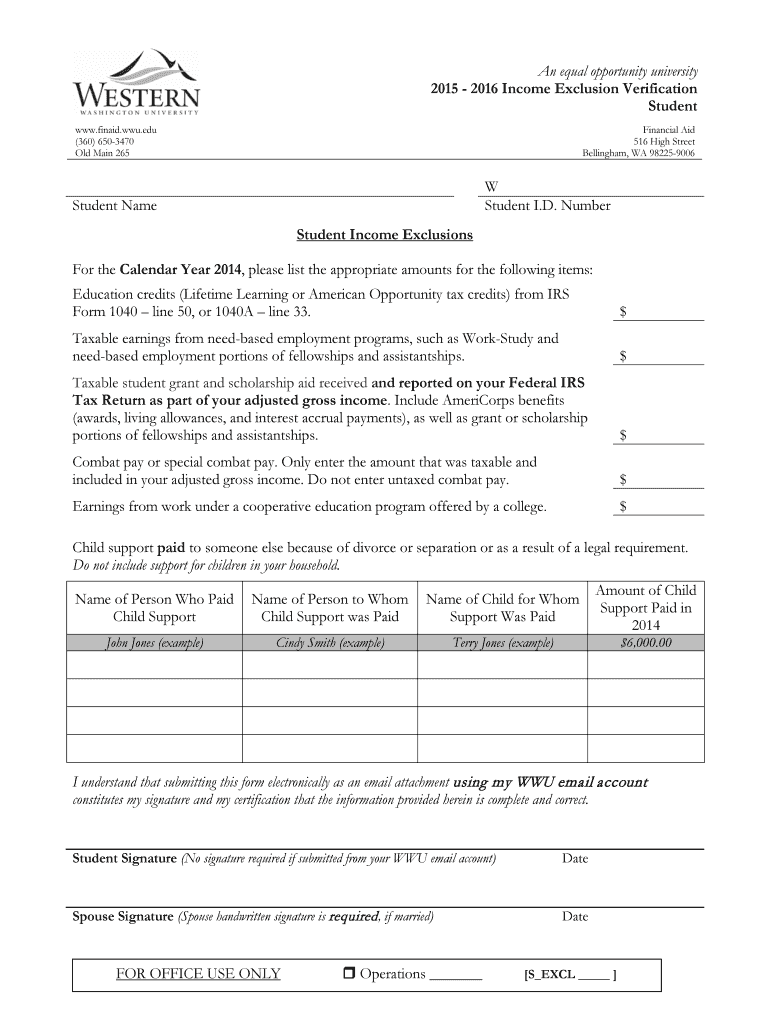 This form is intended for students and their spouses who need to report income exclusions to verify eligibility for financial aid during the 2015-2016 academic year.