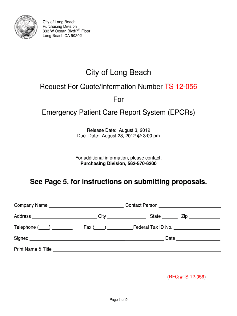 City of Long Beach Purchasing Division 333 W Ocean Blvd/7th Floor Long Beach CA 90802 City of Long Beach Request For Quote/Information Number TS 12056 For Emergency Patient Care Report System (Ears)