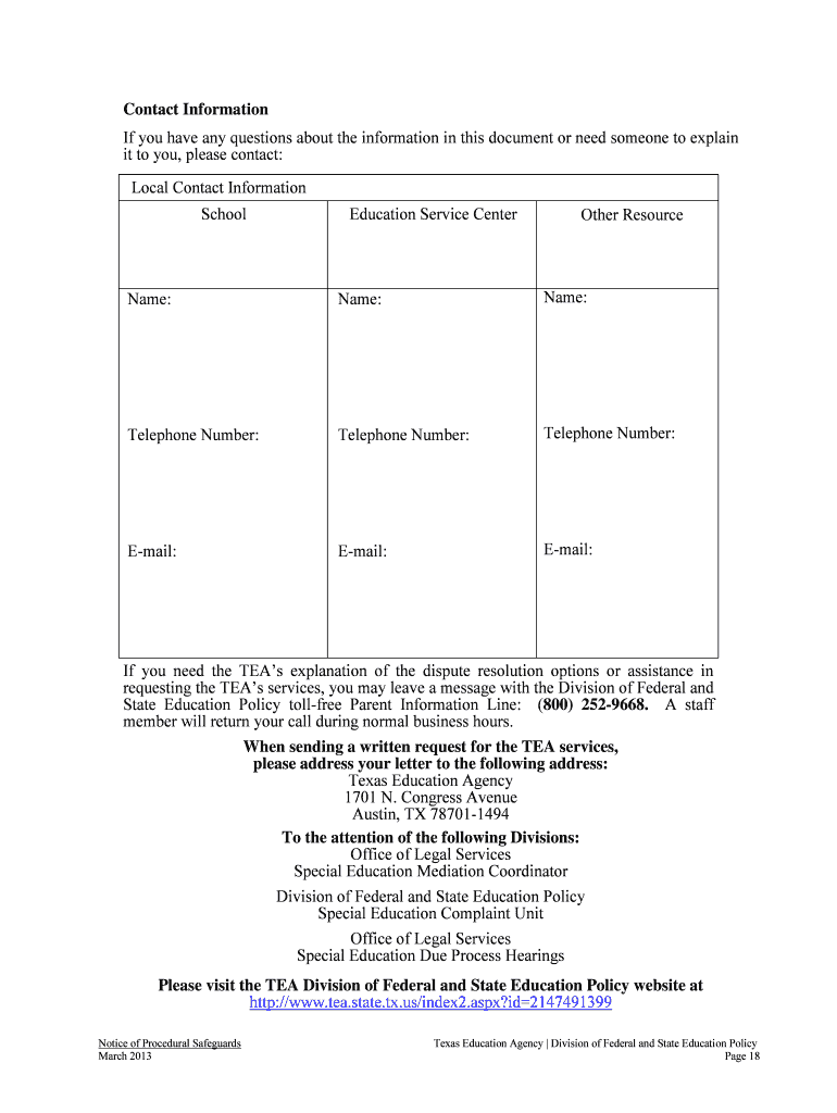 2013. March. Notice of. Procedural. Safeguards ... March 2013. Page 1. Notice of ... at http://framework.esc18.net/. ... protections under the procedural safeguards of ..... newspapers or other media,