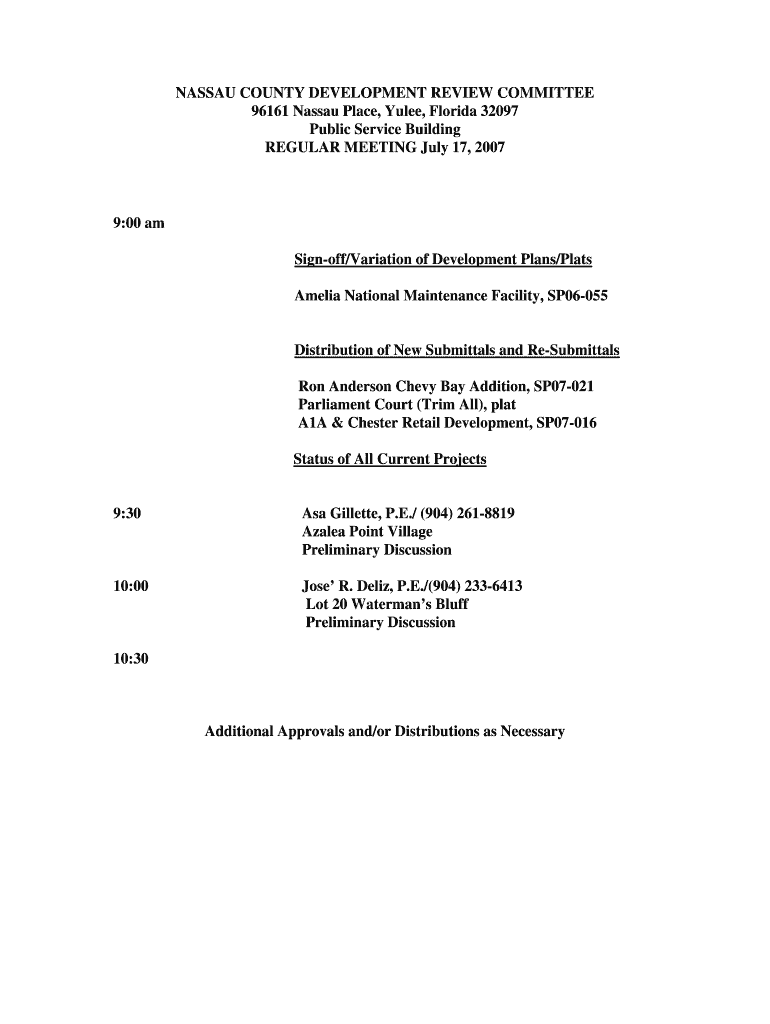 NASSAU COUNTY DEVELOPMENT REVIEW COMMITTEE 96161 Nassau Place, Yule, Florida 32097 Public Service Building REGULAR MEETING July 17, 2007 9:00 am Sign off/Variation of Development Plans/Plats Amelia