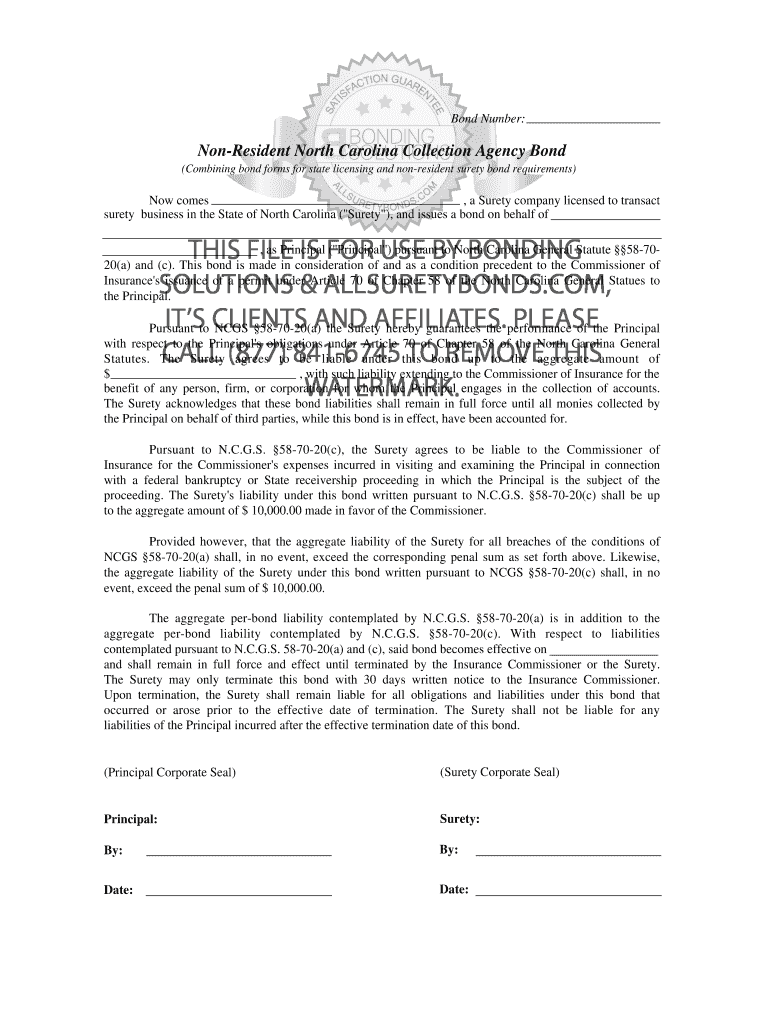 Bond Number: Nonresident North Carolina Collection Agency Bond (Combining bond forms for state licensing and nonresident surety bond requirements) Now comes, a Surety company licensed to transact