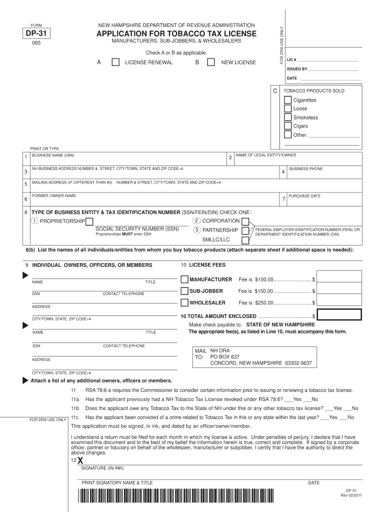 NEW HAMPSHIRE DEPARTMENT OF REVENUE ADMINISTRATION APPLICATION FOR TOBACCO TAX LICENSE 065 MANUFACTURERS, JOBBERS, & WHOLESALERS FOR DRA USE ONLY FORM DP31 Check A or B as applicable. A B LICENSE