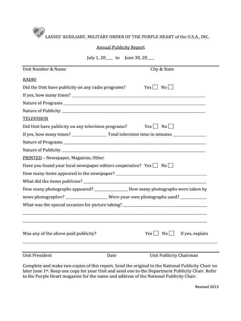 Get the free Annual Publicity Report - purpleheart
