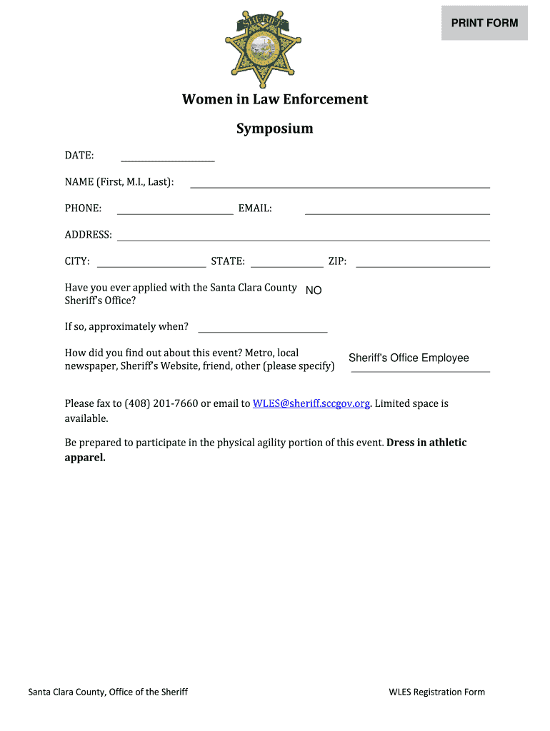 Santa Clara County, Office of the Sheriff WALES Registration Form Women in Law Enforcement Symposium DATE: NAME (First, M.I.,