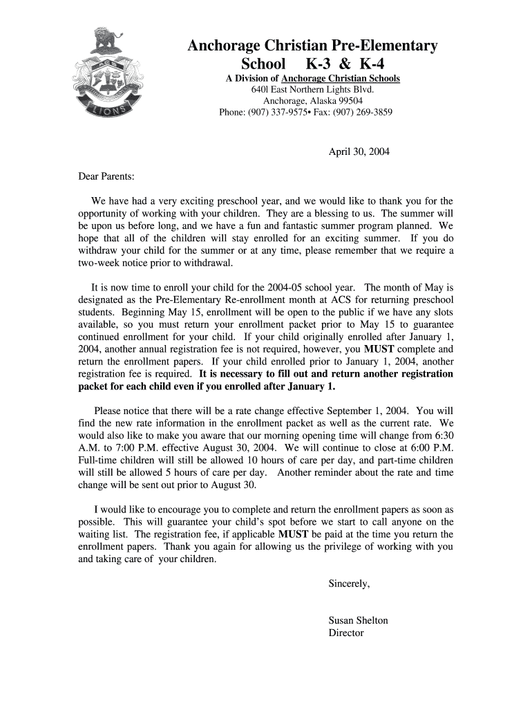 Anchorage Christian Elementary School K3 & K4 A Division of Anchorage Christian Schools 640l East Northern Lights Blvd. Anchorage, Alaska 99504 Phone: (907) 3379575 Fax: (907) 2693859April 30, 2004