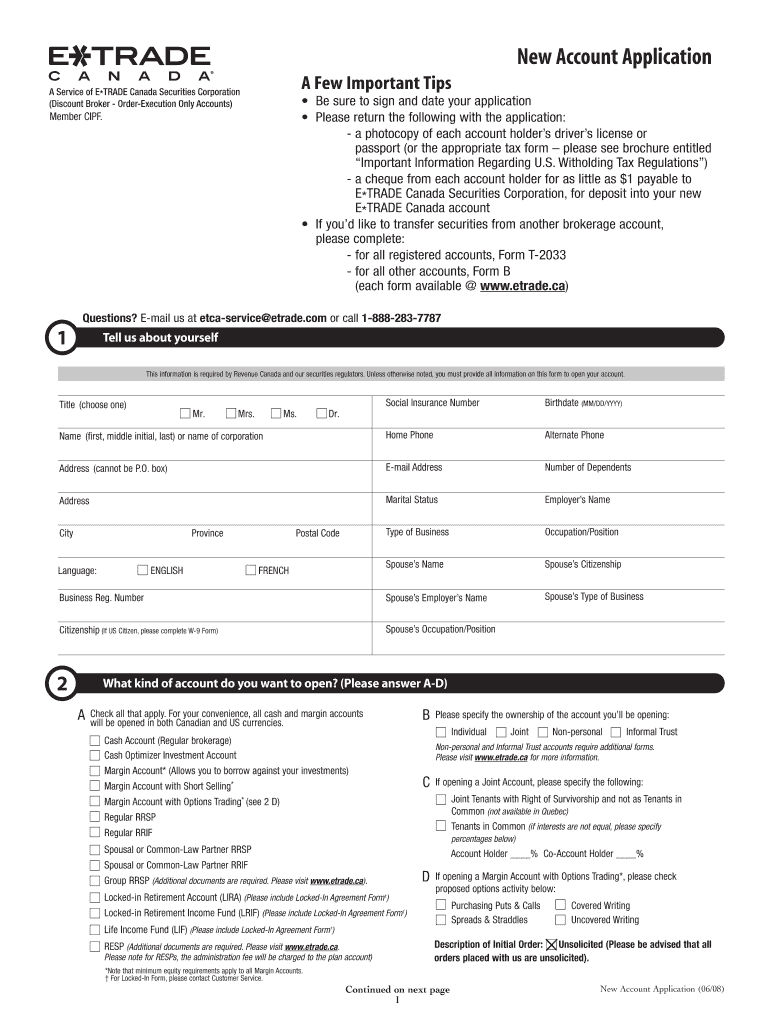 The New Account Application is a business form used by individuals in Canada to open a new account with E*TRADE Canada Securities Corporation.