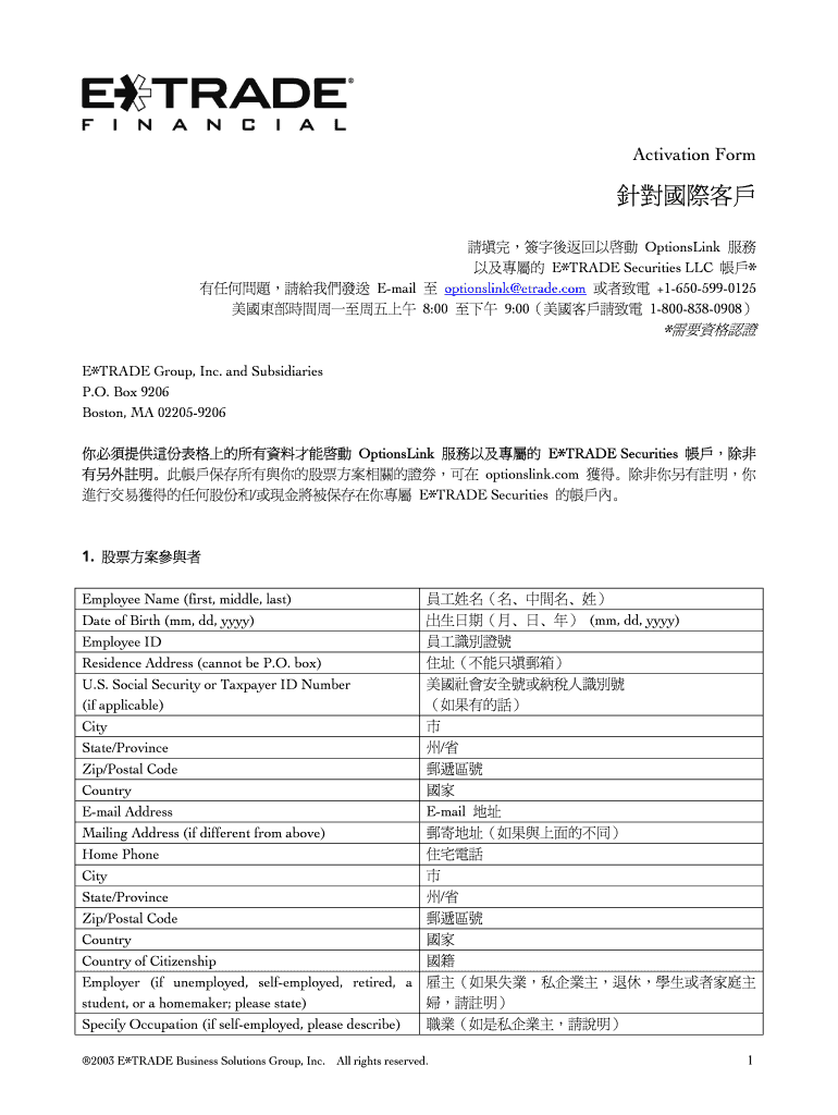 The E*TRADE Securities Account Activation Form is a business document used by employees to activate their OptionsLink service and dedicated E*TRADE Securities LLC account.