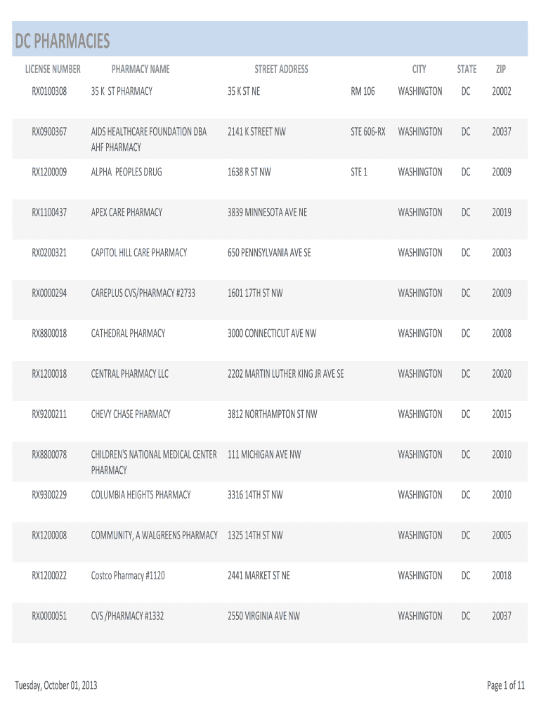 DC PHARMACIES LICENSE NUMBER PHARMACY NAME STREET ADDRESS CITY STATE ZIP RX0100308 35 K ST PHARMACY 35 K ST NE RM 106 WASHINGTON DC 20002 RX0900367 AIDS HEALTHCARE FOUNDATION DBA AHF PHARMACY 2141