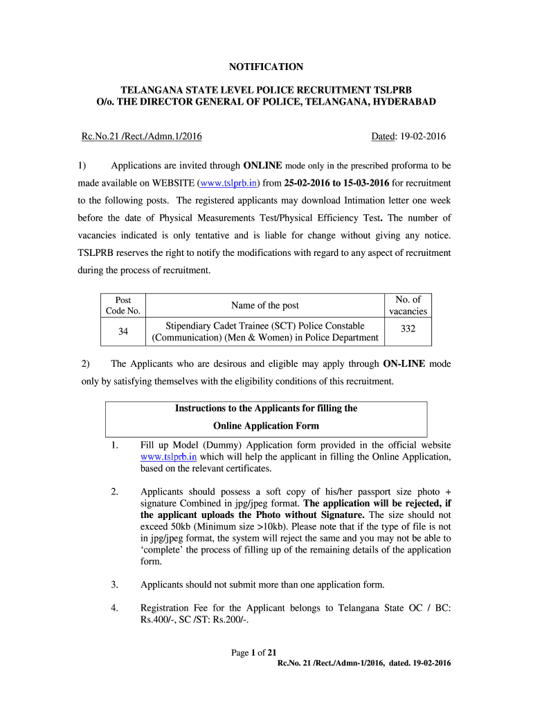 NOTIFICATION TELANGANA STATE LEVEL POLICE RECRUITMENT TYLER O/o. THE DIRECTOR GENERAL OF POLICE, TELANGANA, HYDERABAD Dated: 19-02-2016 RC. No.21 /Rest./Aden.1/2016 1) Applications are invited through
