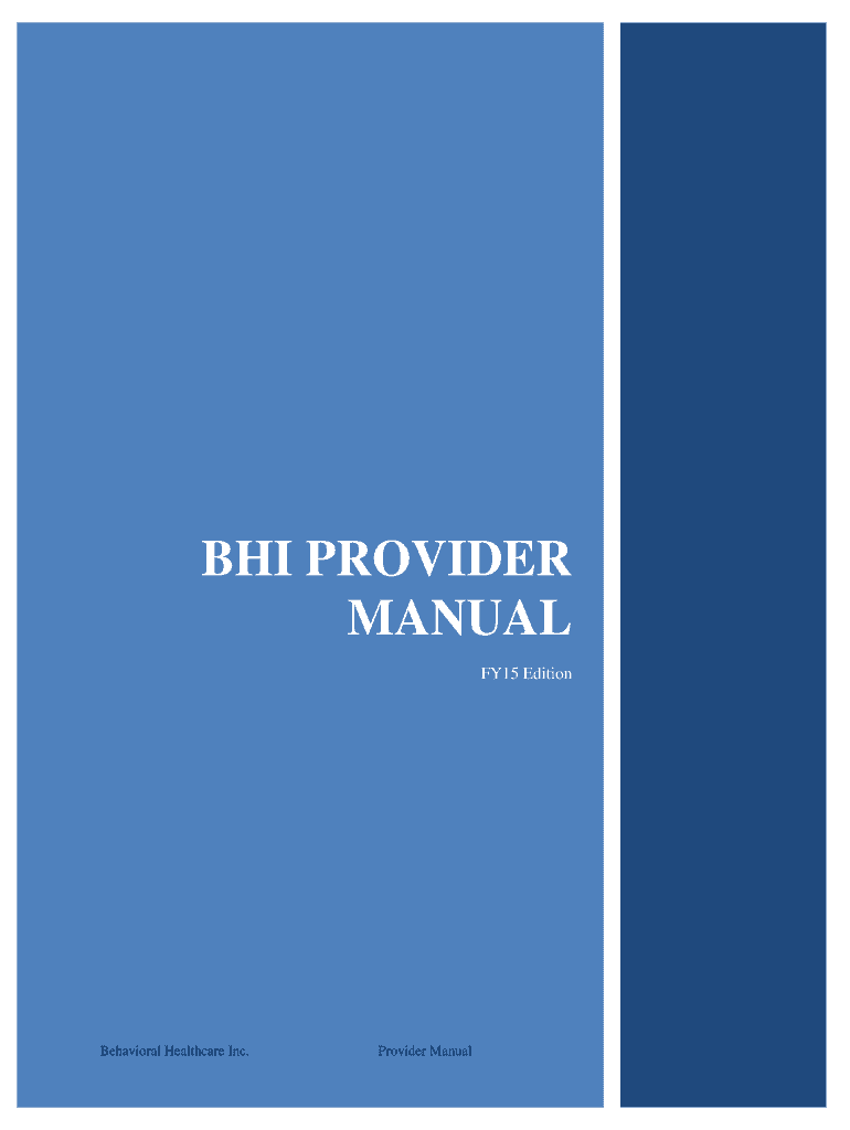 Ll BHI PROVIDER MANUAL FY15 Edition Behavioral Healthcare Inc. Provider Manual 1 Table of Contents Section I General Information .................................................................................................................................3