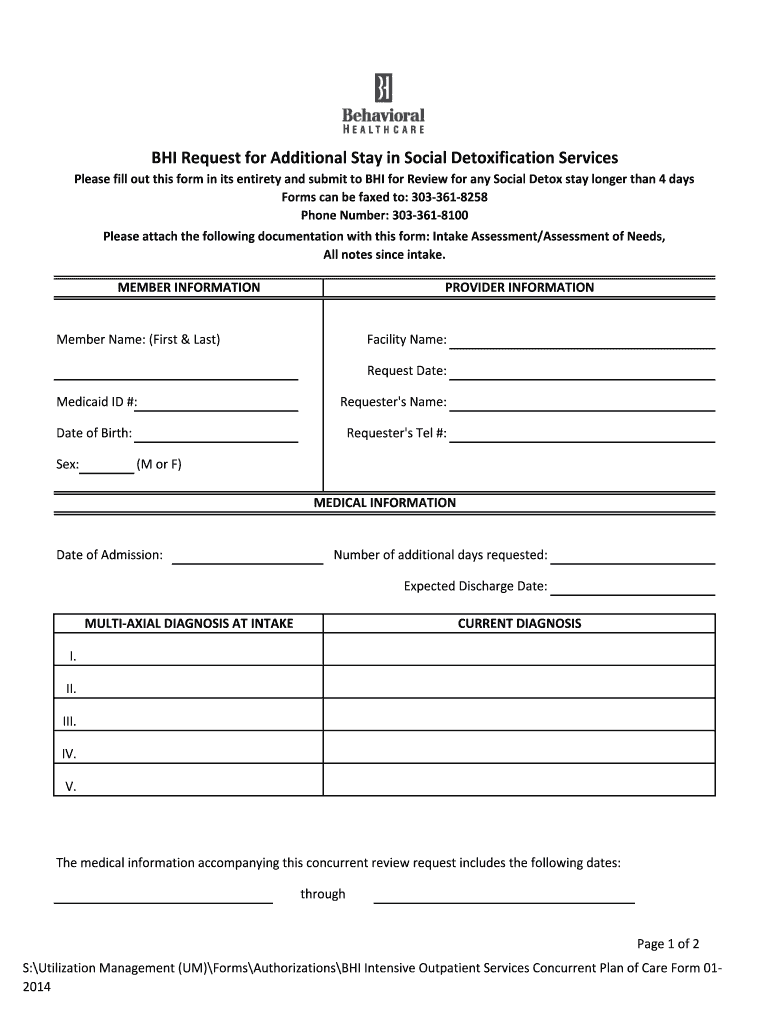 BHI Request for Additional Stay in Social Detoxification Services Please fill out this form in its entirety and submit to BHI for Review for any Social Detox stay longer than 4 days Forms can be faxed