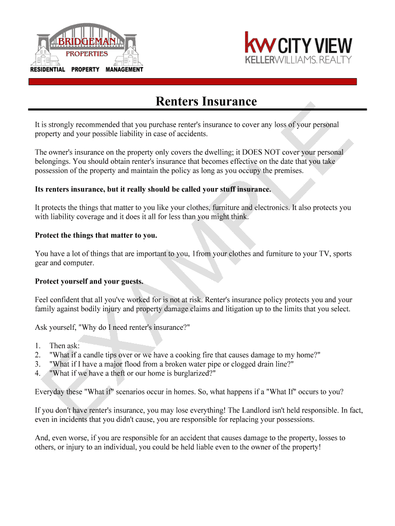 Renters Insurance E It is strongly recommended that you purchase renter's insurance to cover any loss of your personal property and your possible liability in case of accidents. AM PL The owner's