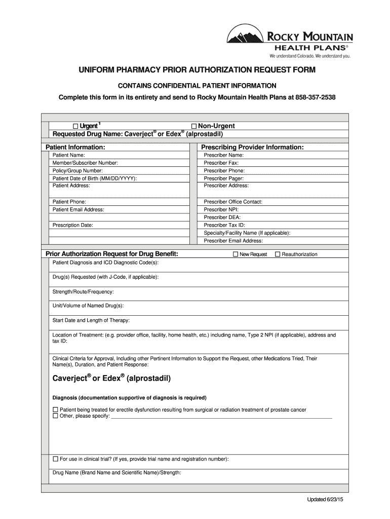 UNIFORM PHARMACY PRIOR AUTHORIZATION REQUEST FORM CONTAINS CONFIDENTIAL PATIENT INFORMATION Complete this form in its entirety and send to Rocky Mountain Health Plans at 8583572538 Urgent 1 Monument