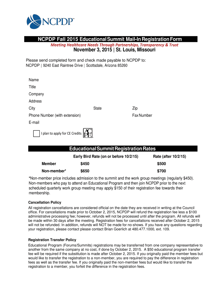 Get the free NCPDP Fall 2015 Educational Summit Mail-In Registration - ncpdp