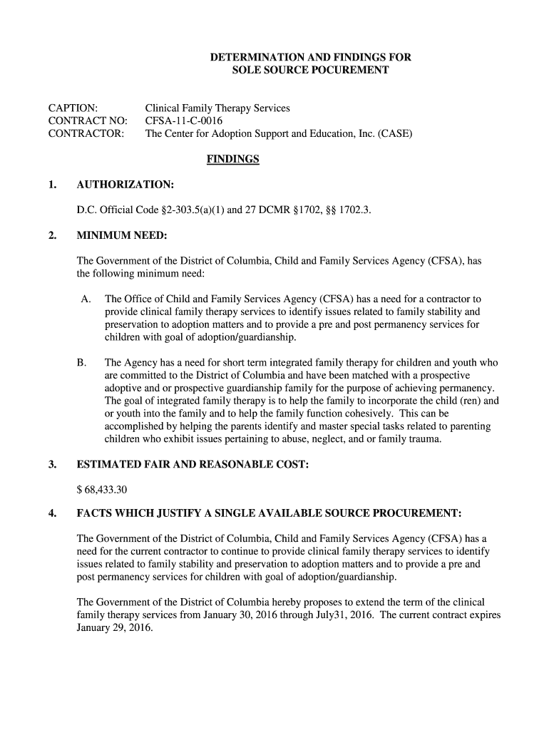 DETERMINATION AND FINDINGS FOR SOLE SOURCE PROCUREMENT CAPTION: CONTRACT NO: CONTRACTOR: Clinical Family Therapy Services CFSA11C0016 The Center for Adoption Support and Education, Inc. (CASE) FINDINGS