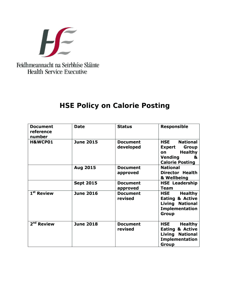 HSE Policy on Calorie Posting Document reference number H&WCP01 Date Status Responsible June 2015 Document developed Aug 2015 Document approved Sept 2015 Document approved Document revised HSE National