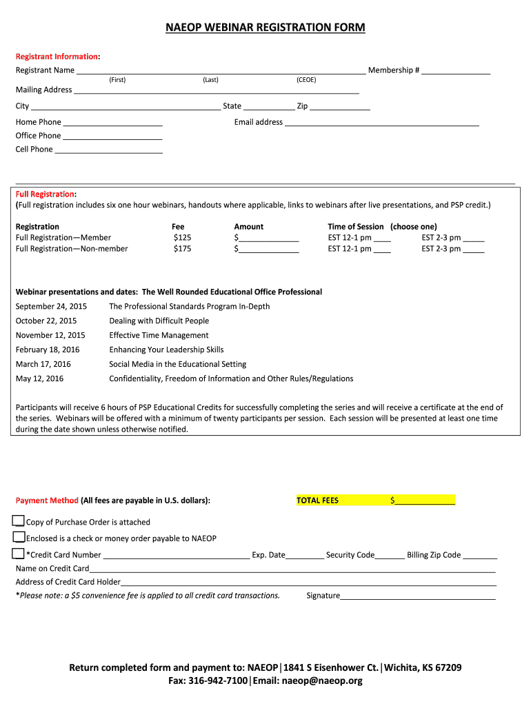 The NAEOP webinar registration form is a document used to register for webinars hosted by the National Association of Educational Office Professionals.