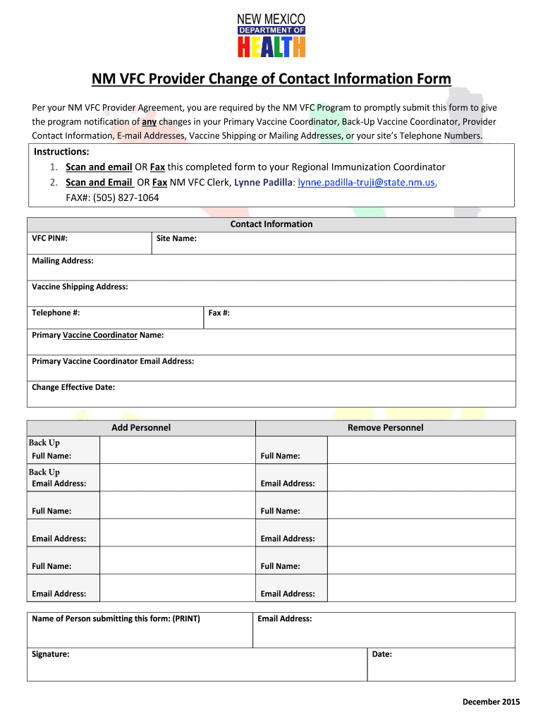 Get the free NM VFC Provider Change of Contact Information Form - nmhealth
