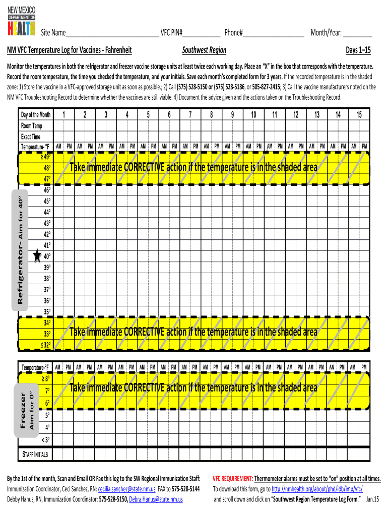 Site Name AFC PIN# Phone# NM AFC Temperature Log for Vaccines Fahrenheit Month/Year: Southwest Region Days 1 15 Monitor the temperatures in both the refrigerator and freezer vaccine storage units