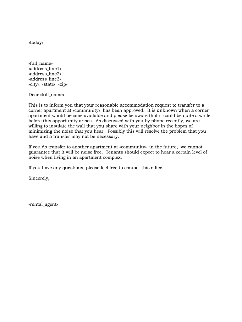 Today full name address line1 address line2 address line3 city, state zip Dear full name: This is to inform you that your reasonable accommodation request to transfer to a corner apartment at community