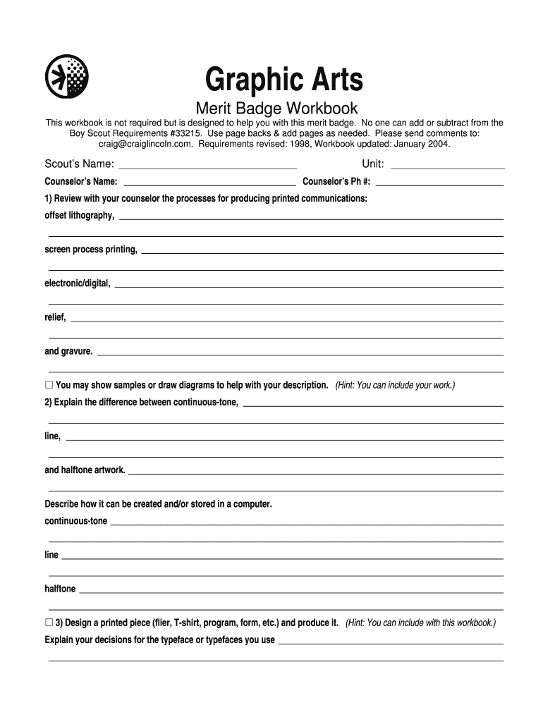 Graphic Arts Merit Badge Workbook This workbook is not required but is designed to help you with this merit badge. No one can add or subtract from the Boy Scout Requirements #33215. Use page backs