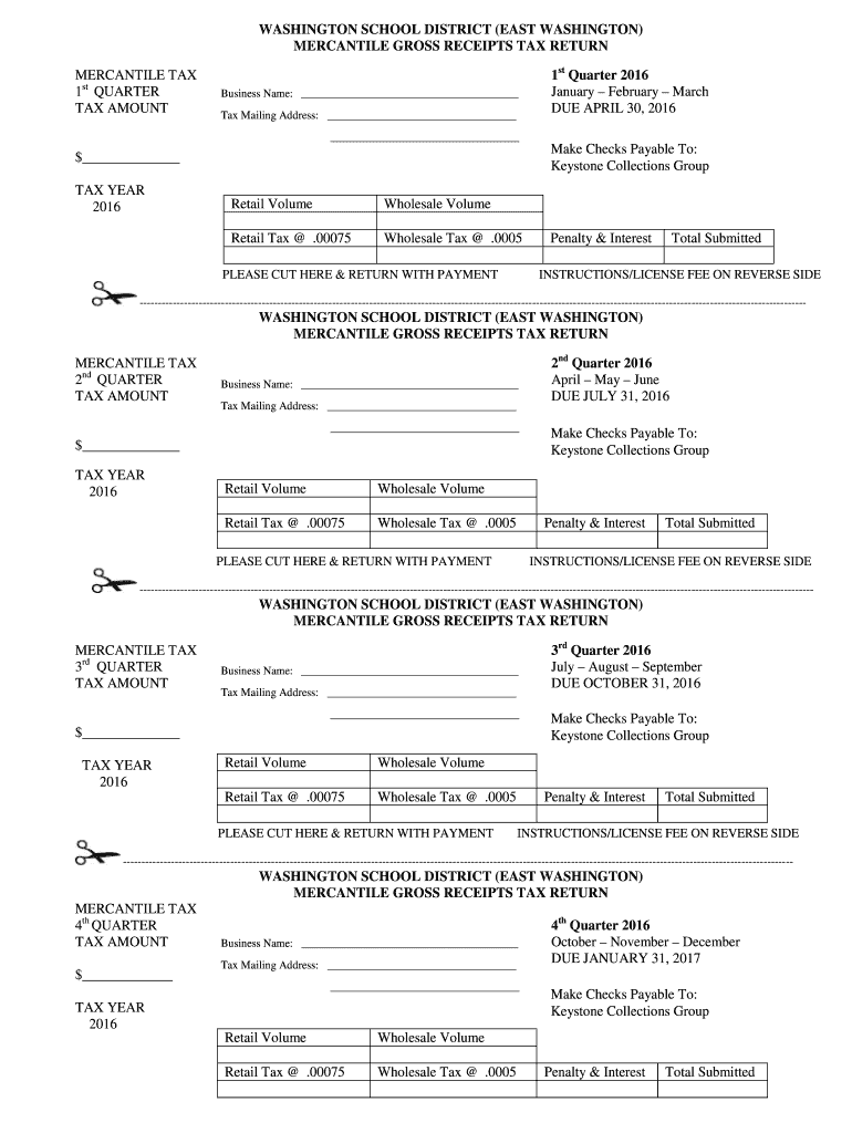 WASHINGTON SCHOOL DISTRICT (EAST WASHINGTON) MERCANTILE GROSS RECEIPTS TAX RETURN MERCANTILE TAX 1st QUARTER TAX AMOUNT Business Name: Tax Mailing Address: 1st Quarter 2016 January February March