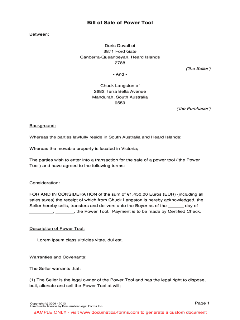 Bill of Sale of Power Tool Between: Doris Duvall of 3871 Ford Gate CanberraQueanbeyan, Heard Islands 2788 ('the Seller ') And Chuck Langston of 2682 Terra Bella Avenue Mandurah, South Australia 9559