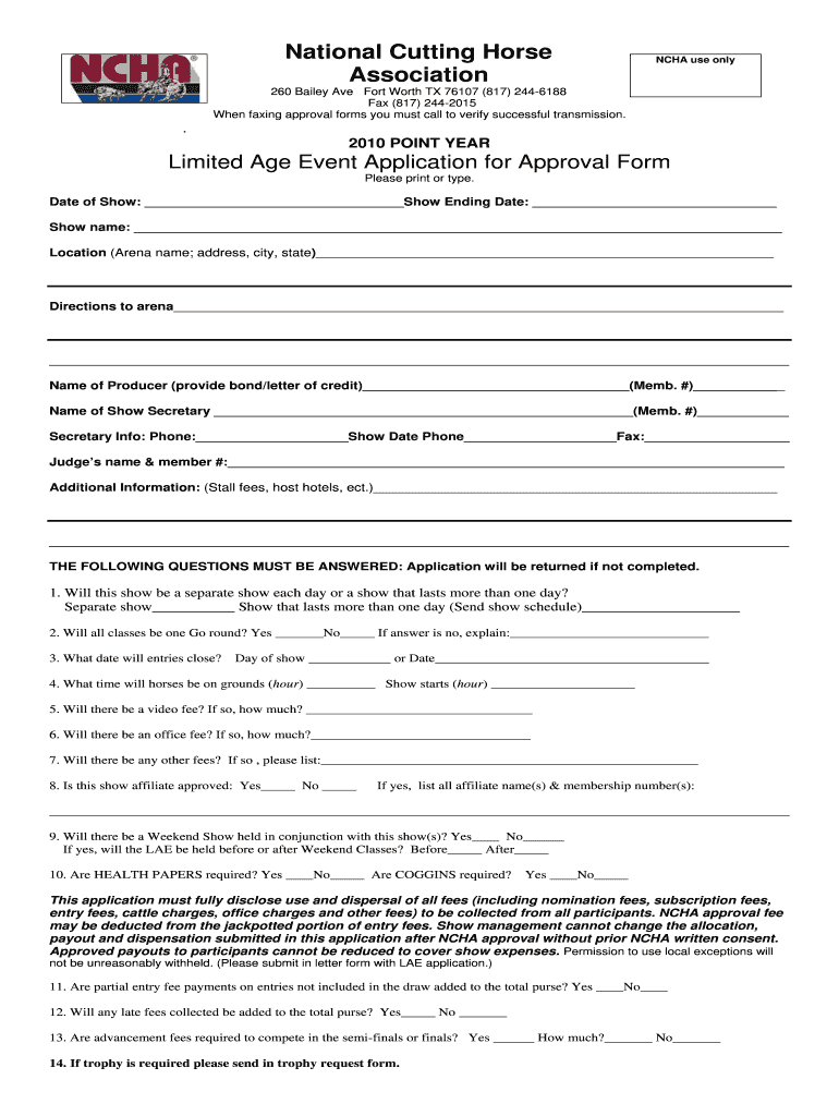 National Cutting Horse Association NCAA use only 260 Bailey Ave Fort Worth TX 76107 (817) 2446188 Fax (817) 2442015 When faxing approval forms you must call to verify successful transmission. . 2010