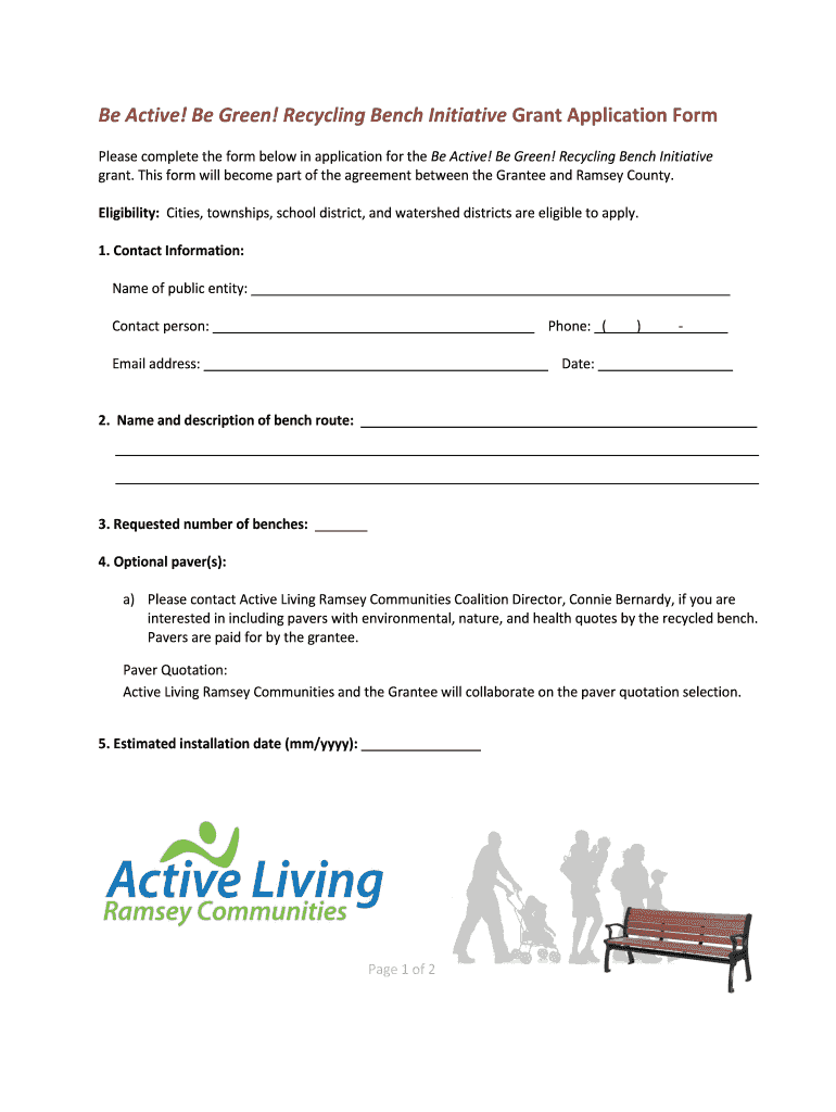 Be Active! Be Green! Recycling Bench Initiative Grant Application Form Please complete the form below in application for the Be Active! Be Green! Recycling Bench Initiative grant. This form will become