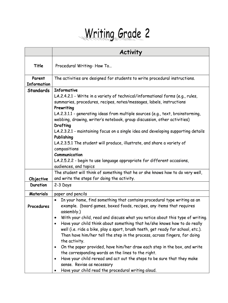 Activity Title Procedural Writing How To Parent The activities are designed for students to write procedural instructions. Information Standards Informative LA.2.4.2.1 Write in a variety of technical/informational