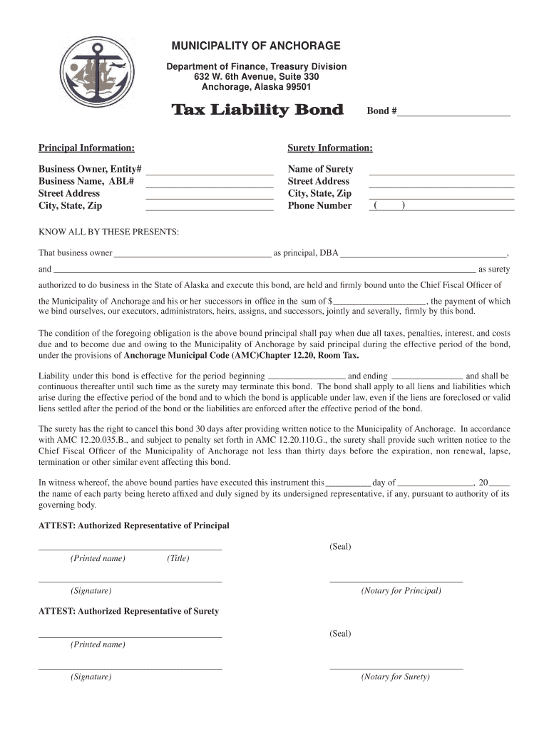 MUNICIPALITY OF ANCHORAGE Department of Finance, Treasury Division 632 W. 6th Avenue, Suite 330 Anchorage, Alaska 99501 Tax Liability Bond # Principal Information: Surety Information: Business Owner,