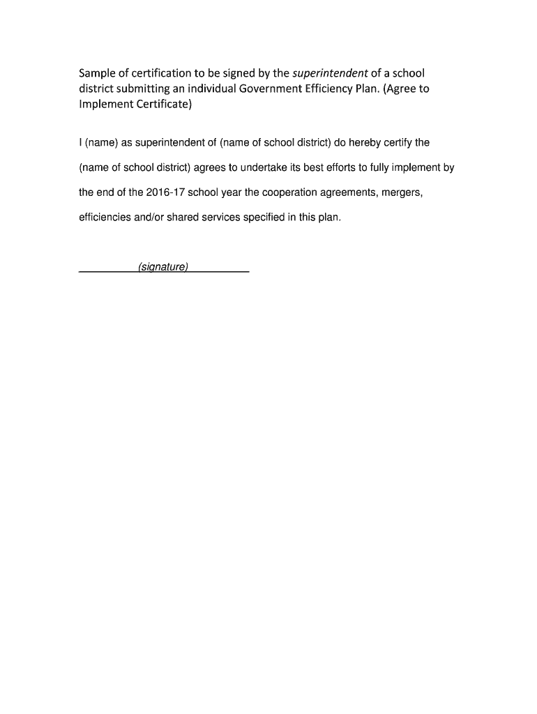 Sample of certification to be signed by the superintendent of a school district submitting an individual Government Efficiency Plan. (Agree to Implement Certificate) I (name) as superintendent of