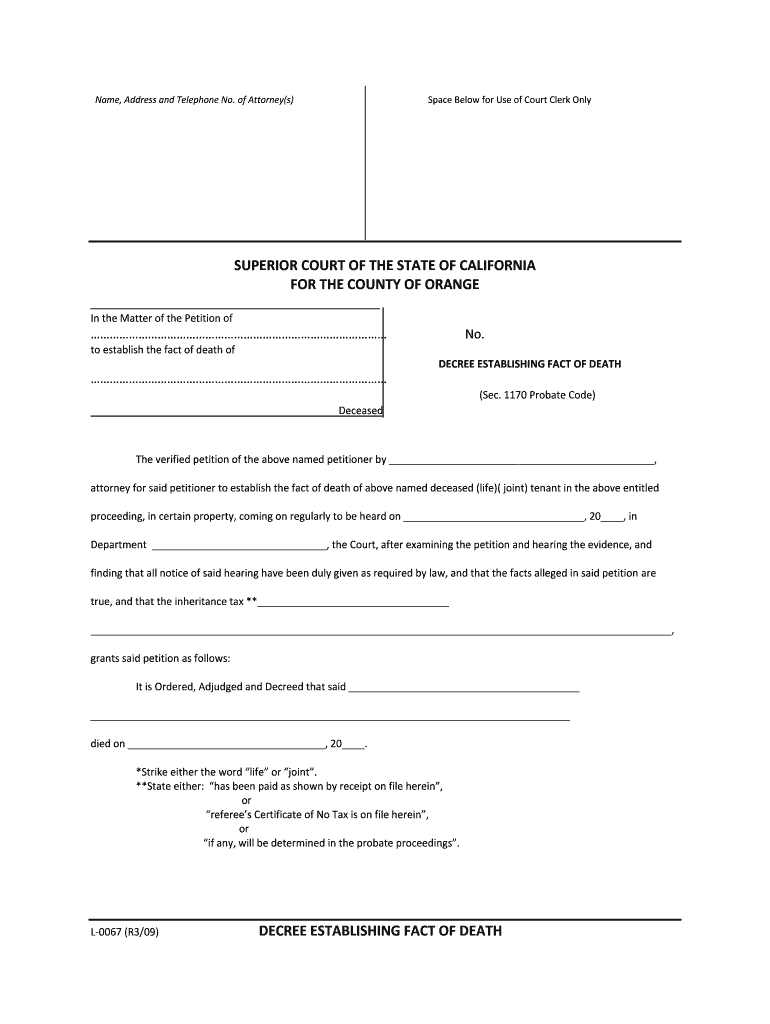 Name, Address and Telephone No. of Attorney(s) Space Below for Use of Court Clerk Only SUPERIOR COURT OF THE STATE OF CALIFORNIA FOR THE COUNTY OF ORANGE In the Matter of the Petition of No. to establish