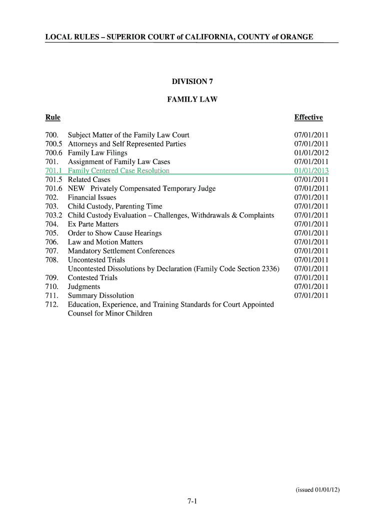 LOCAL RULES SUPERIOR COURT of CALIFORNIA, COUNTY of ORANGE DIVISION 7 FAMILY LAW Rule 700. 700.5 700.6 701. 701.1 701.5 701.6 702. 703. 703.2 704. 705. 706. 707. 708. 709. 710. 711. 712. Effective