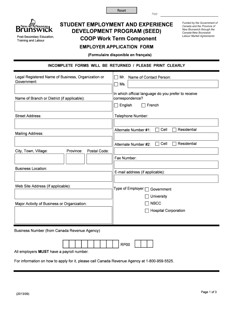 Reset PostSecondary Education, Training and Labor App: STUDENT EMPLOYMENT AND EXPERIENCE DEVELOPMENT PROGRAM (SEED) COOP Work Term Component Funded by the Government of Canada and the Province of