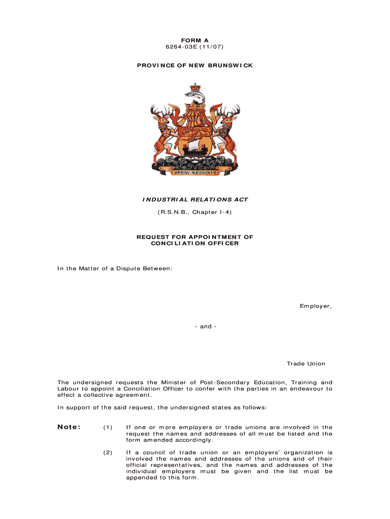 Reset FORM A 626403E (11/07) PROVINCE OF NEW BRUNSWICK INDUSTRIAL RELATIONS ACT (R.S.N.B., Chapter I4) REQUEST FOR APPOINTMENT OF CONCILIATION OFFICER In the Matter of a Dispute Between: Employer,