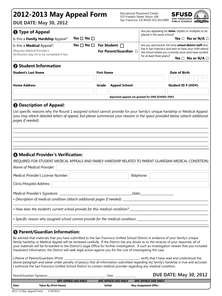 20122013 May Appeal Form Educational Placement Center 555 Franklin Street, Room 100 San Francisco, CA 94102 415.241.6085 DUE DATE: May 30, 2012, The Appeals Process The Medical and Family Hardship