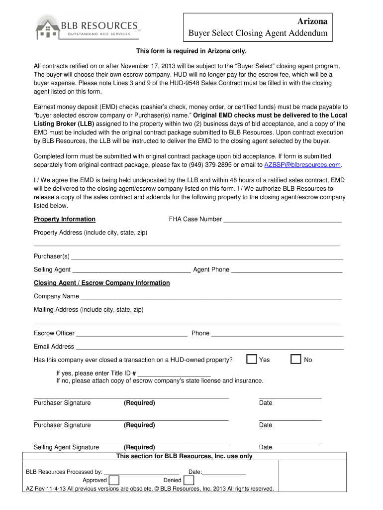 Get the free Arizona Buyer Select Closing Agent Addendum