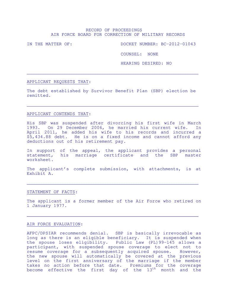 This document records the proceedings of the Air Force Board regarding the applicant's request for remission of a debt established by the Survivor Benefit Plan due to his remarriage and subsequent