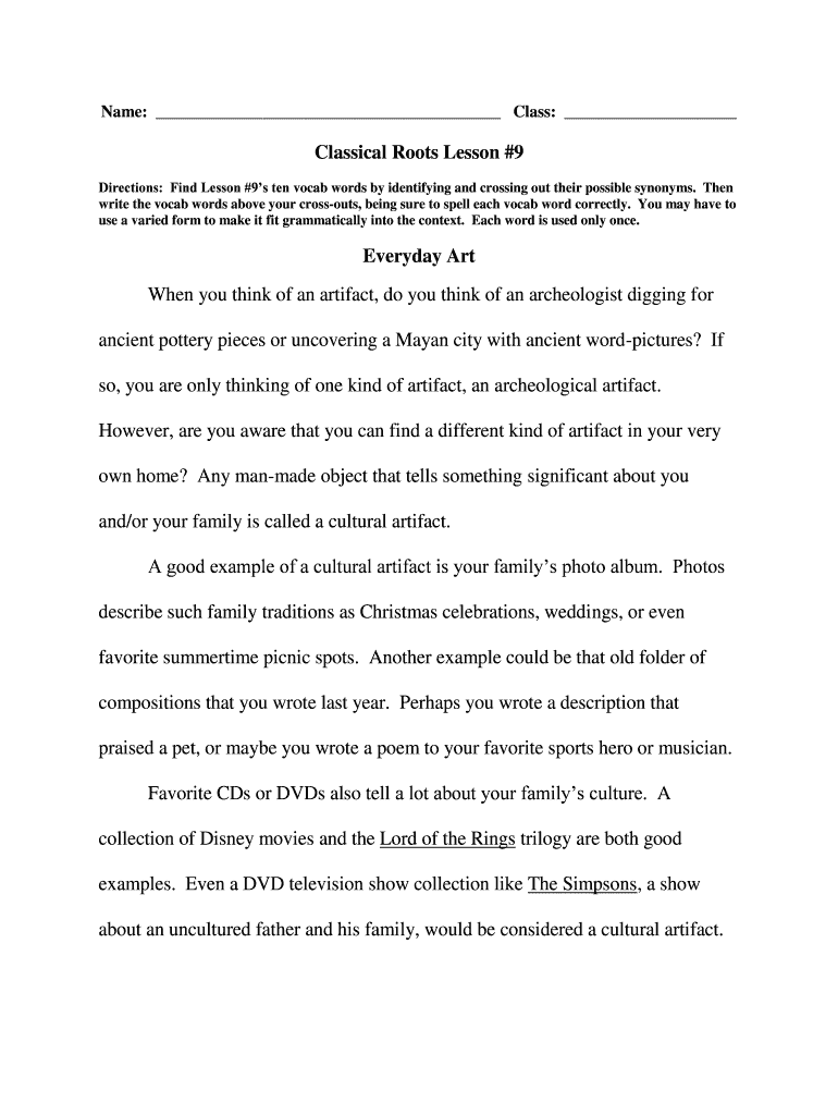 Name: Class: Classical Roots Lesson #9 Directions: Find Lesson #9s ten vocab words by identifying and crossing out their possible synonyms. Then write the vocab words above your crosscuts, being sure