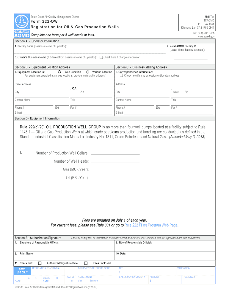 South Coast Air Quality Management District Mail To: SCALED P.O. Box 4944 Diamond Bar, CA 917650944 Form 222OW Registration for Oil & Gas Production Wells Tel: (909) 3963385 www.aqmd.gov Complete