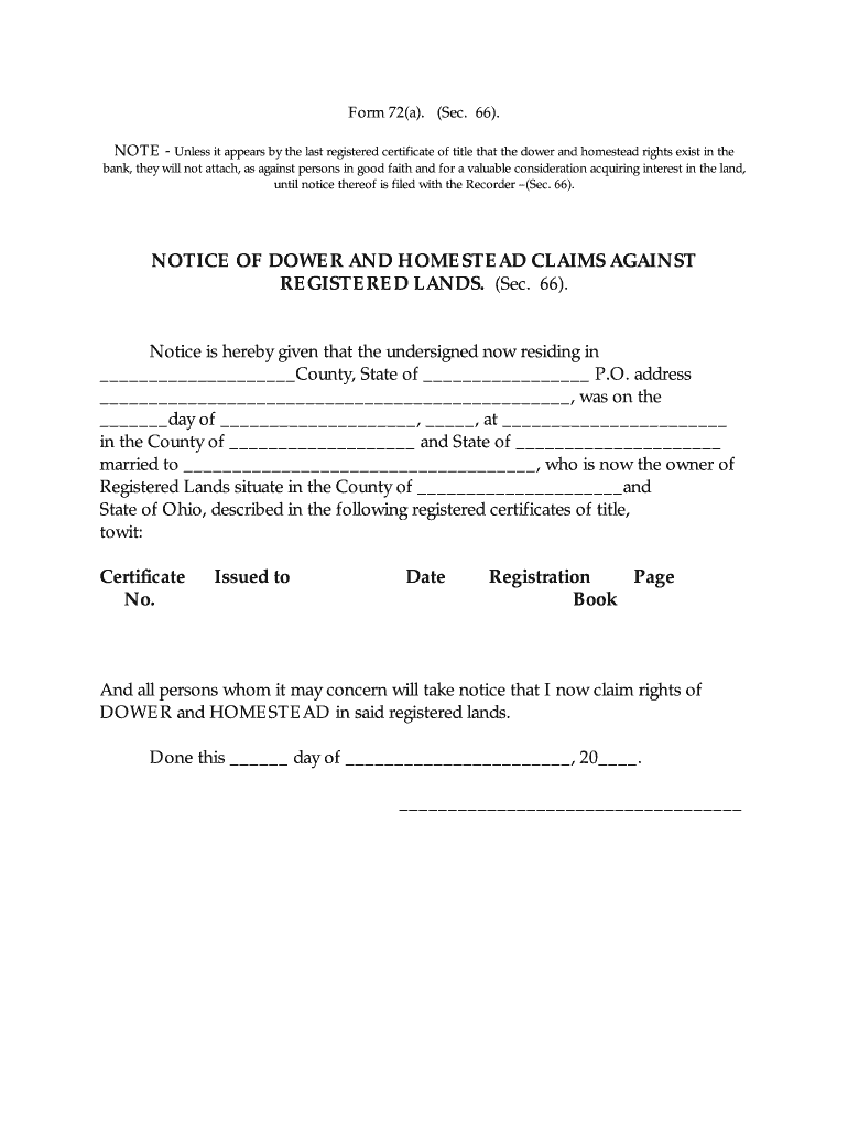 Form 72(a). (Sec. 66). NOTE Unless it appears by the last registered certificate of title that the dower and homestead rights exist in the bank, they will not attach, as against persons in good faith