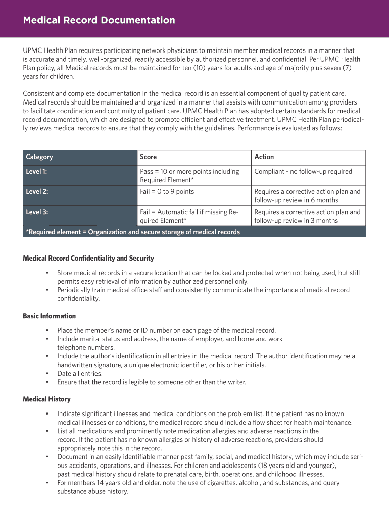 UPMC Health Plan requires participating network physicians to maintain member medical records in a manner that