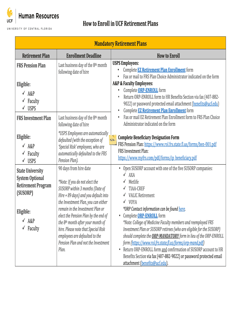 How to Enroll in UCF Retirement Plans Mandatory Retirement PlansRetirement PlanEnrollment Deadline FRS Pension Ineligible: A&P Faculty Splash business day of the 8th month following date of hire FRS