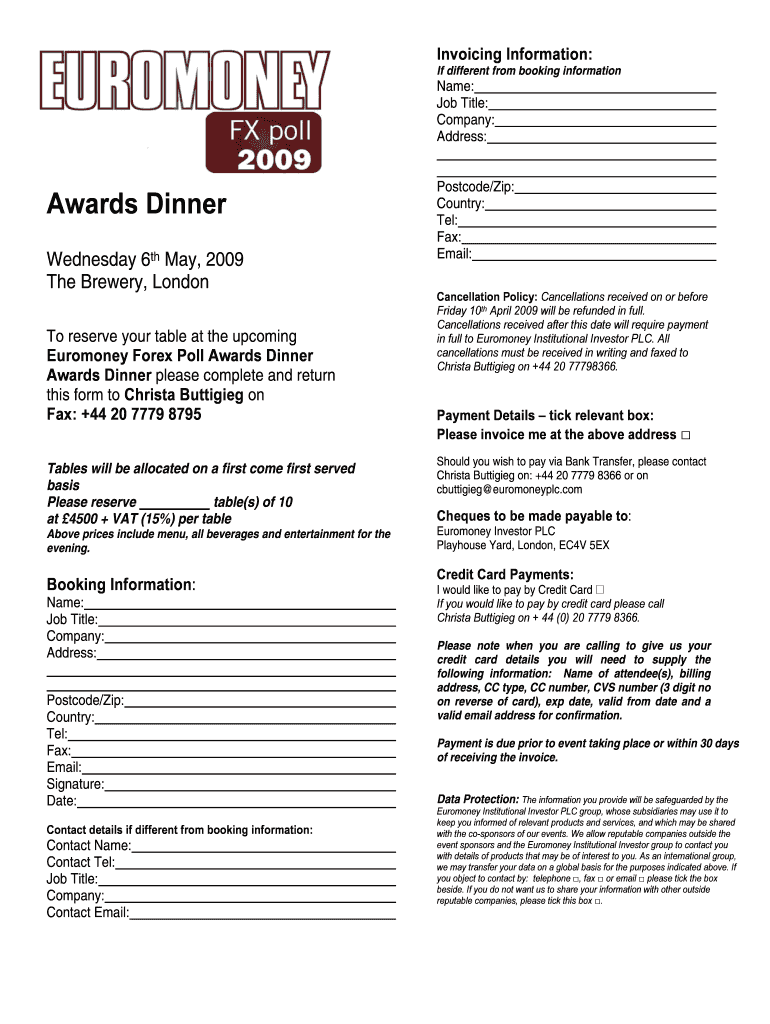 Invoicing Information: If different from booking information Name: Job Title: Company: Address: Awards Dinner Wednesday 6th May 2009 The Brewery, London To reserve your table at the upcoming Euro
