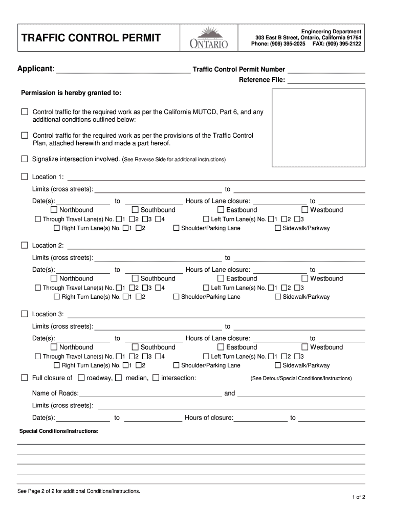 Engineering Department 303 East B Street, Ontario, California 91764 Phone: (909) 3952025 FAX: (909) 3952122 TRAFFIC CONTROL PERMIT Applicant: Traffic Control Permit Number Reference File: Permission